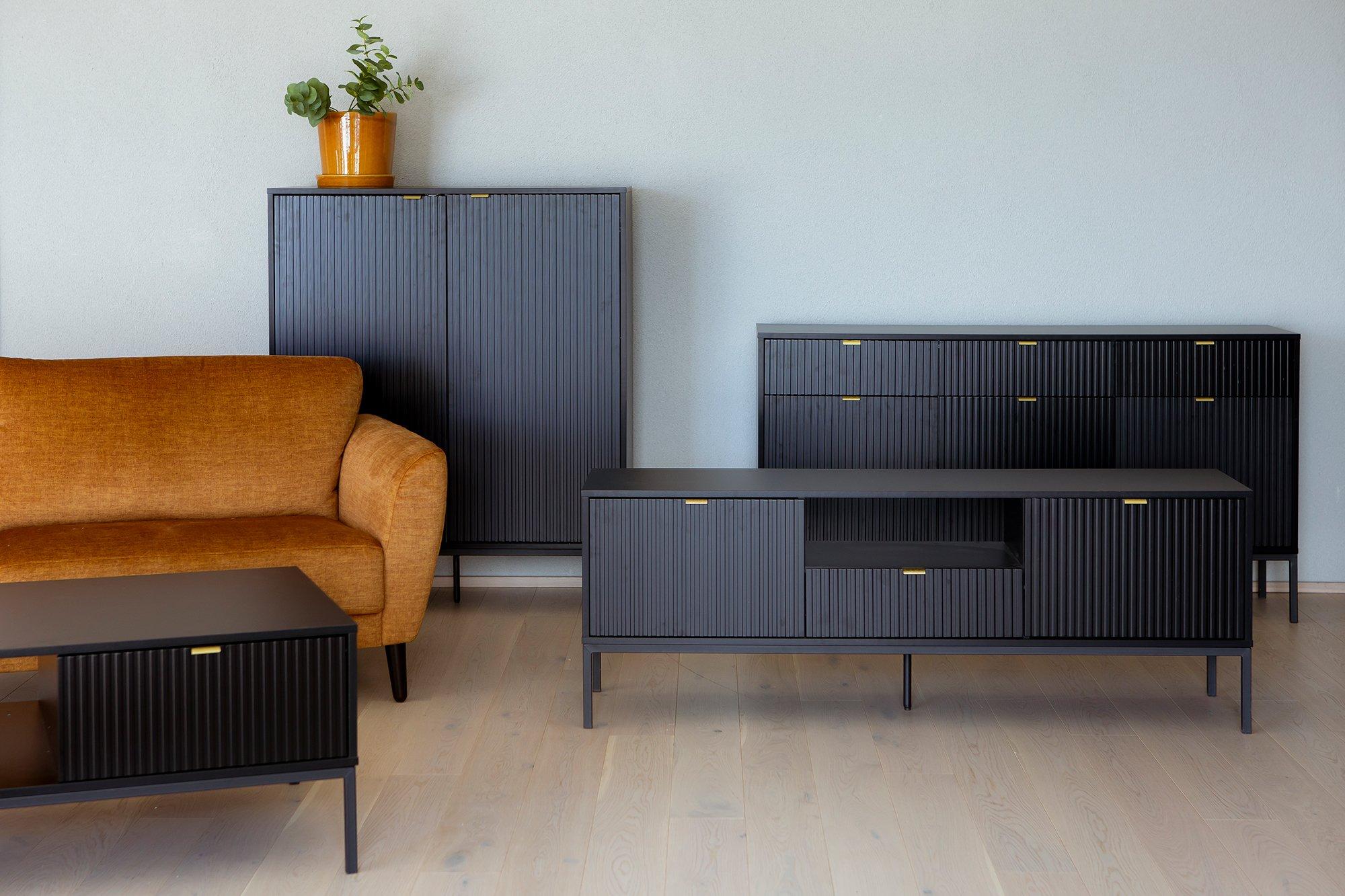 Caisa TV alus on kaasaegne ja stiilne valik, mis ühendab praktilisuse ja elegantse disaini. Telerialuse raam on valmistatud mustast mööbliplaadist ning selle saledad metalljalad rõhutavad modernset välimust. Kullavärvi käepidemed lisavad luksust ja rafineeritust. Sellel telerialusel on palju hoiuruumi, hoides meelelahutusseadmed ja muud tarvikud kenasti korras. Caisa TV alus on ideaalne valik, kui soovite lisada oma kodule modernset ja klassikalist stiili.